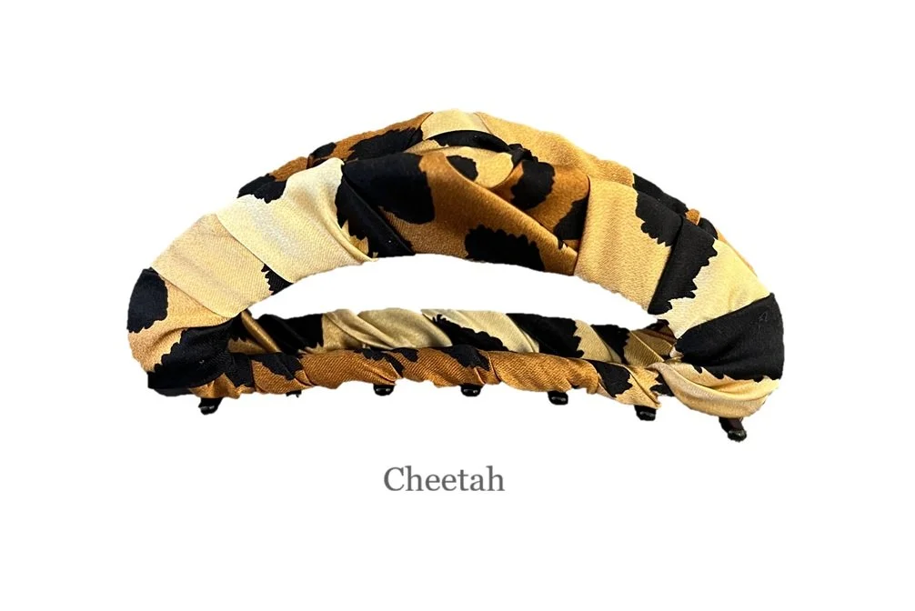 Shown here in our New Cheetah printed silk, and on our model in azure.