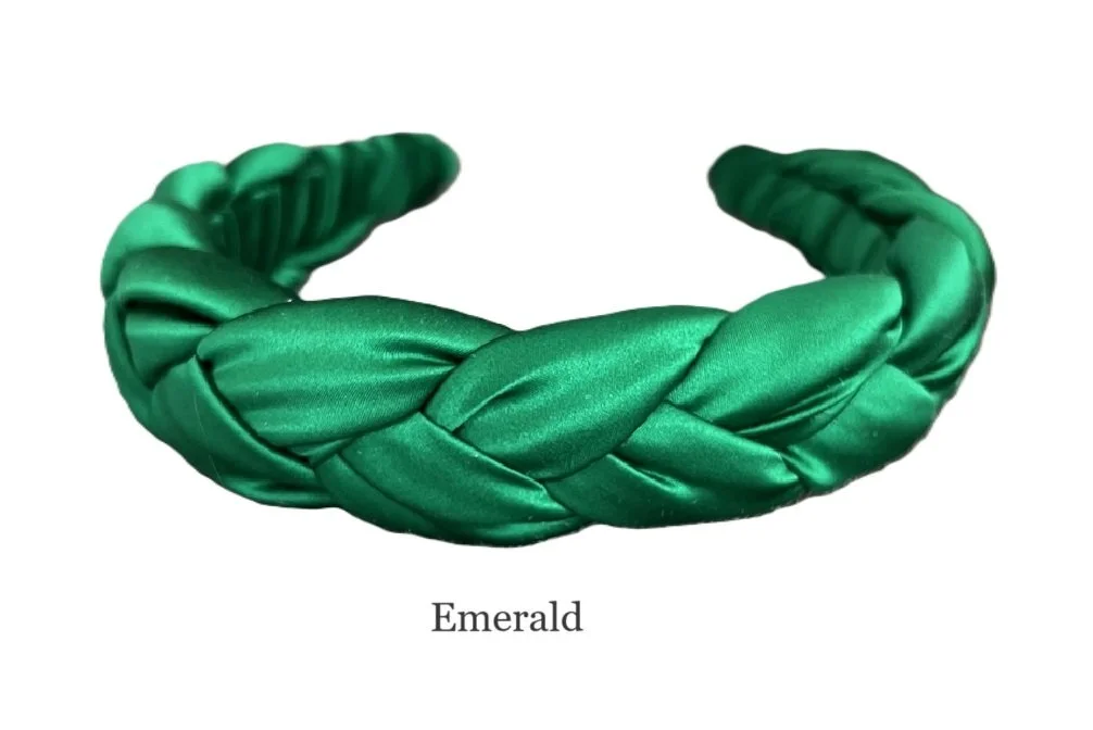 This 1/2" French headband is wrapped with silk, then lightly stuffed, braided silk is added on top. it is 7/8" thick and the width of the headband measures 1 1/4" in total. If you wear this headband in a solid color that blends with your hair it gives the illusion of thicker hair and the padded silk adds “height” and more fullness to your hair. As shown here on one of our clients. This is a