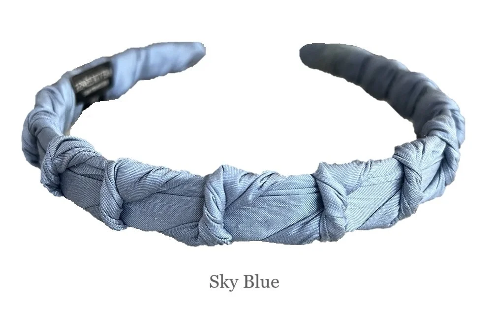 Silk Dupioni. Casual yet elegant. This pretty silk dupioni headband is softly twisted onto a 1/2” French plastic base that ensures ultimate comfort. The result is a refined, sophisticated headband that’s perfect for everyday wear and simple occasions alike. Easy to wear, it beautifully complements fine, medium, and thick hair types with natural ease and a secure, comfortable fit. Shown here in sky blue silk dupioni for a soft, polished finish.