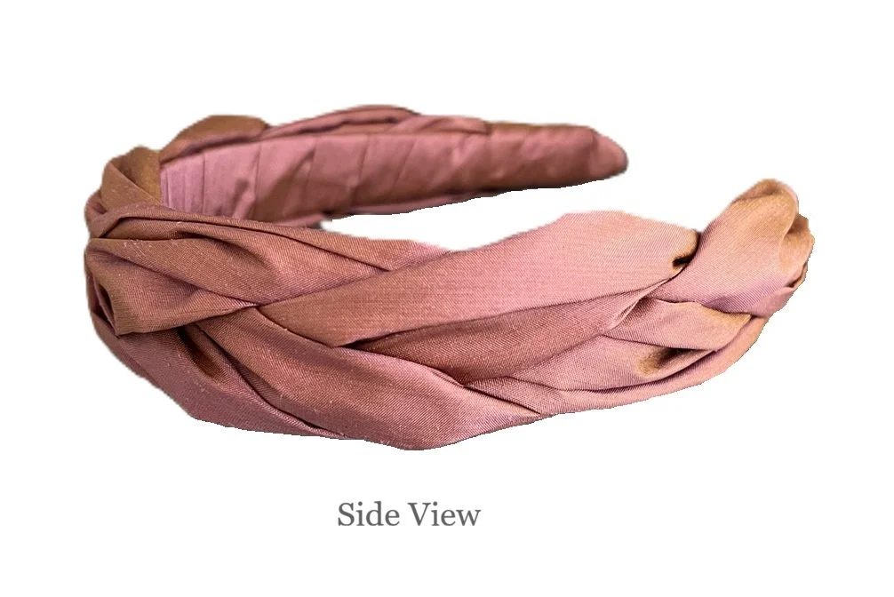 New to our Collection. Silk Dupioni. Casual yet elegant. This pretty silk dupioni headband is softly braided onto a 1” French plastic base that ensures ultimate comfort, and measures approximately 1 1/2” wide. The soft, textured braid provides gentle coverage and a touch of lift to your hair. The result is a refined, sophisticated headband that’s perfect for everyday wear. Because it adds subtle height, it beautifully complements fine, medium, and thick hair types with natural ease. Shown here in dusty rose silk dupioni for a soft, polished finish.