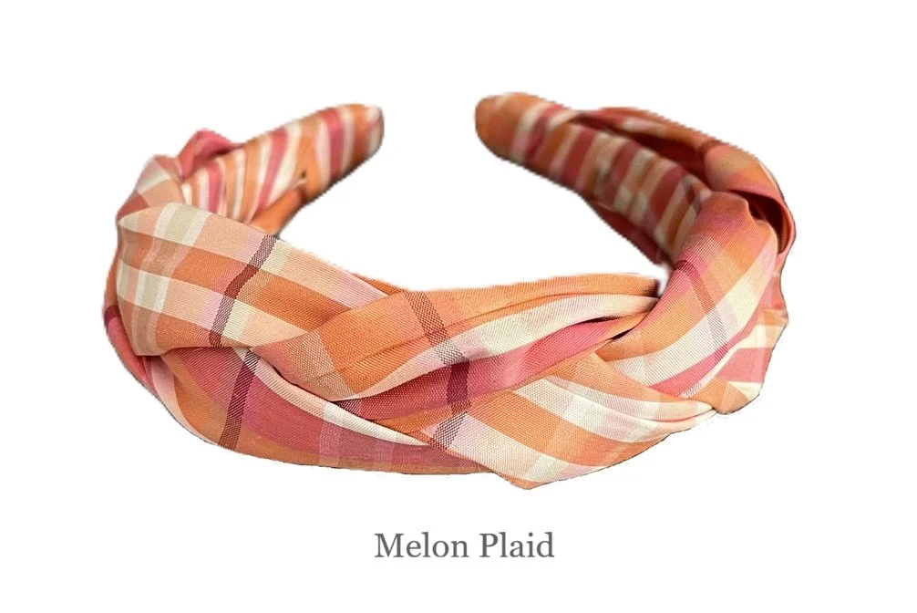 New to our Collection. Silk Dupioni. Casual yet elegant. This pretty silk dupioni headband is softly braided onto a 1” French plastic base that ensures ultimate comfort, and measures approximately 1 1/2” wide. The soft, textured braid provides gentle coverage and a touch of lift to your hair. The result is a refined, sophisticated headband that’s perfect for everyday wear. Because it adds subtle height, it beautifully complements fine, medium, and thick hair types with natural ease. Shown here in dusty melon plaid silk dupioni for a soft, polished finish.